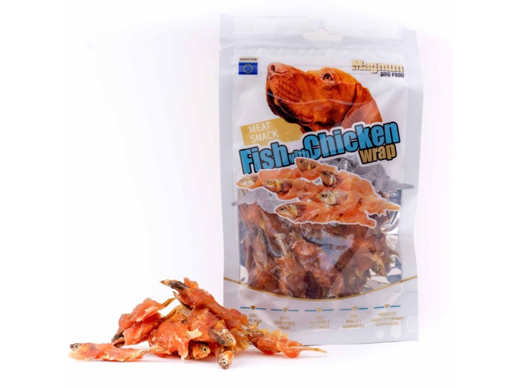 Měkká, přírodní masová pochoutka pro psy. Sušená rybka omotaná proužkem kuřecí svaloviny.